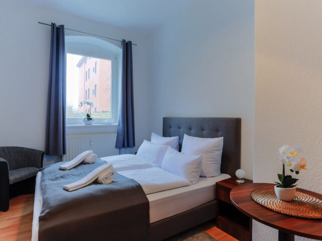 Die Schlafräume sind zur ruhigen Gartenseite hin gelegen.– Nichtraucher Wohnung.