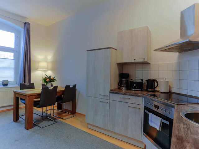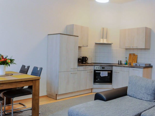 Ferienwohnung Sophie – 48 m²Großes Doppelbett (1,60 x 2,00 m) Möglichkeit einer Aufbettung im Wohnbereich, Badezimmer mit Badewanne – großer Wohnraum mit Esstisch– Küche mit Herd und Backofen, Dunstabzugshaube, Mikrowelle, Kühlschrank mit 3*** Fach, Kaffeemaschine und Wasserkocher.